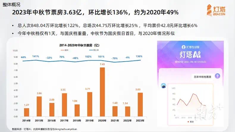 本年的中秋节(9月29日)是中秋国庆8天长假的首日,亦是2023国庆档首日,世界单日票房报收3.63亿元,环比增长136%,险些追平2022年中秋档(9月10日—9月12日)的总票房3.78亿元。对比昨年国庆档首日(10月1日),本年中秋国庆档首日的票房得益和不雅影东说念主次也出现了大幅上升,电影商场复苏态势彰着。