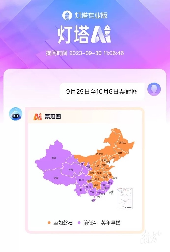 体育彩票(11选5)贪婪另据灯塔专科版发布的《2023年中秋节数据不雅察》,《坚如磐石》和《前任4》双双杀青单日票房破亿的得益,呈现区域性“双雄割据”:《坚如磐石》在江苏、北京、山东、上海、重庆等多数朔方省份票房登顶,《前任4》在广东、浙江、四川等多数南边省份票房登顶。