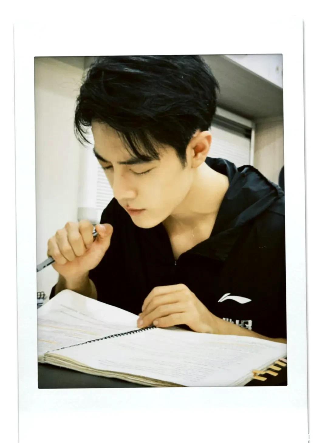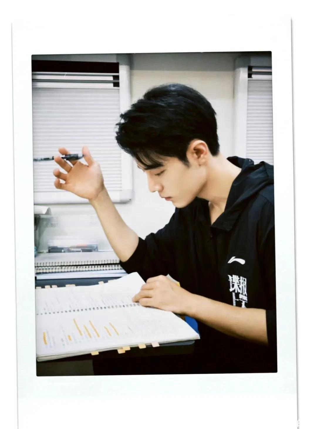 两张像片展现肖战在《情报上不封顶》片场专注研读脚本的花式。他身着玄色无袖背心,手执写满札记的脚本,垂头颦蹙或转笔千里想,细节体现演员的专科气派。
